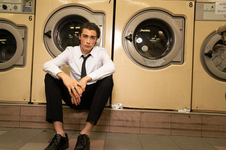Young man in shirt and tie sitting in front of washing machines.