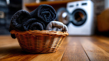 A woven basket holds neatly folded towels in shades of gray and black, positioned on the polished wooden floor beside a washing machine in a cozy laundry room.