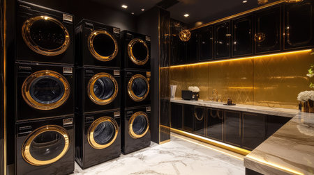 High-end laundromat with glossy black washing machines, golden lighting, and marble countertops, highlighting sophistication in everyday tasks