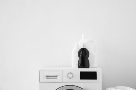 Washing machine with bottles of detergent near light wall