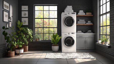 Bright and modern laundry room featuring a washing machine and dryer, surrounded by lush plants and stylish decor, creating a cozy and organized space.