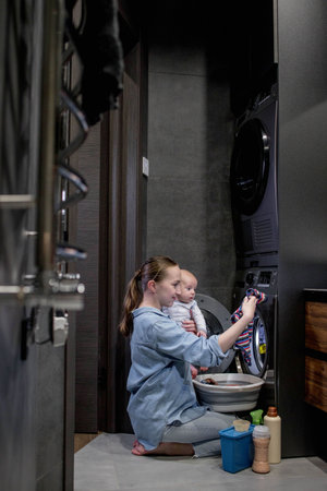 Washing children's clothes. A woman does housework with a child in her arms.