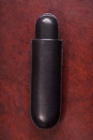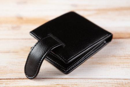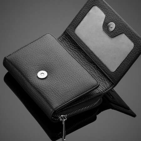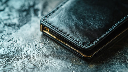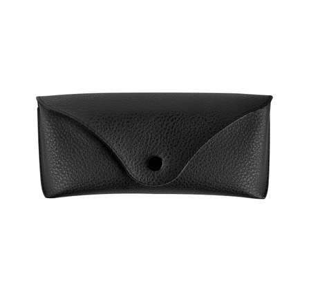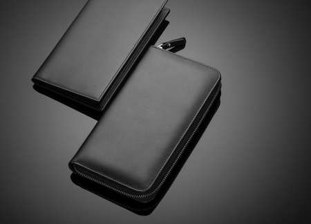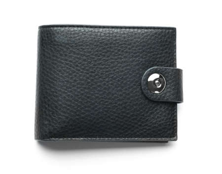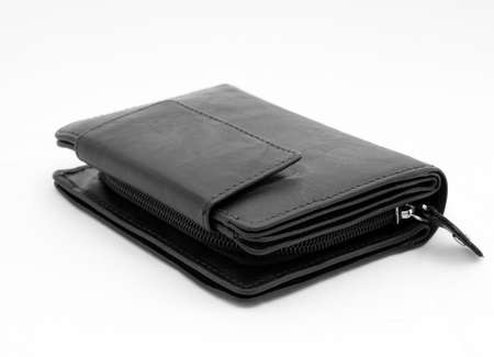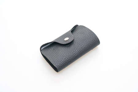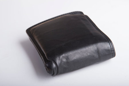 a close up isolated shot of a black leather business wallet with reflection of light on its side on a white background with soft shadows