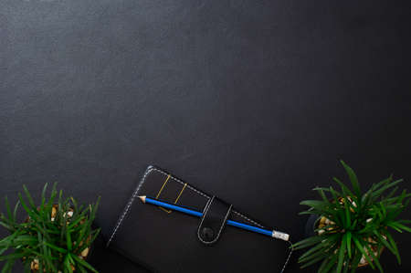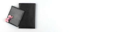 Banner office desktop with black notebooks, minimal workspace concept with white background and copy space, top view