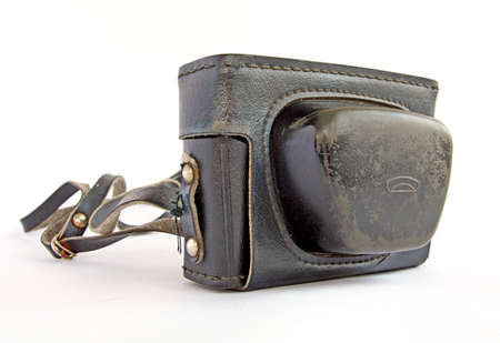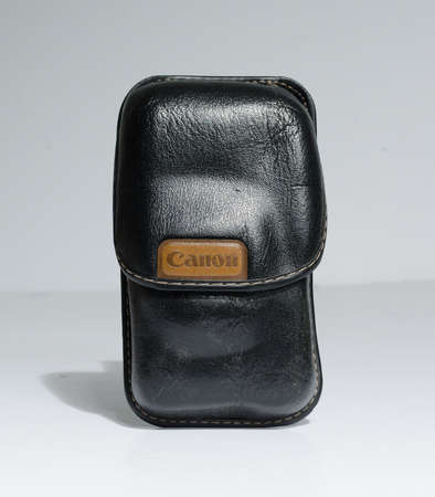 london, england, 05/05/2019 A retro vintage canon film leather camera pouch and case, isolated on a white background. Protective leather bag to protect vintage antique retro film cameras