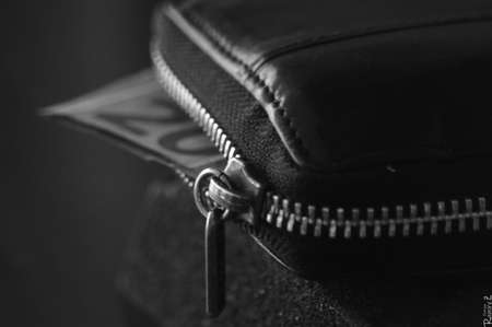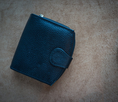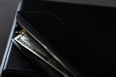 Corner of a cash 1 dollar bill with a leather wallet in the background. Selective focus, copy space for text