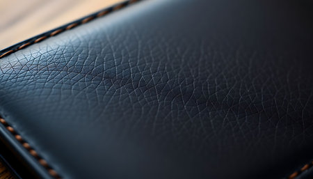 A sleek black leather accessory rests centrally on a contemporary vehicle's console, illuminated by gentle daylight, highlighting its refined texture among built-in