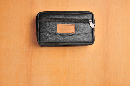 studio lighting. black leather, suitcase, bag, briefcase. On a wooden background. The background is dark. Close-up