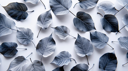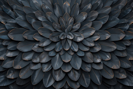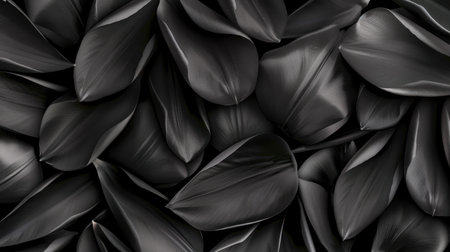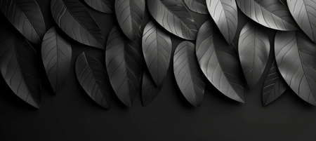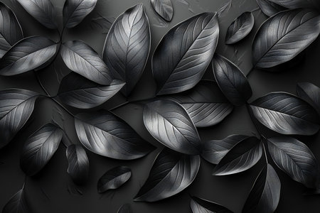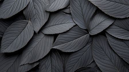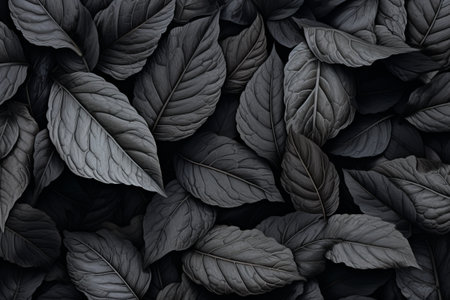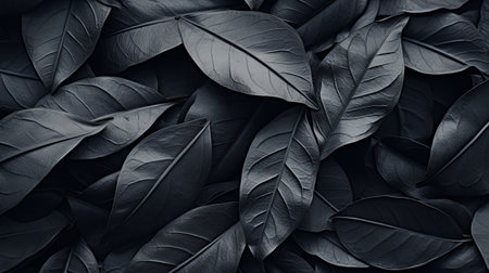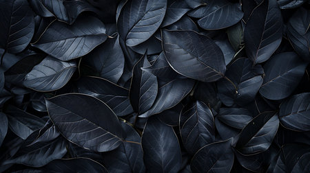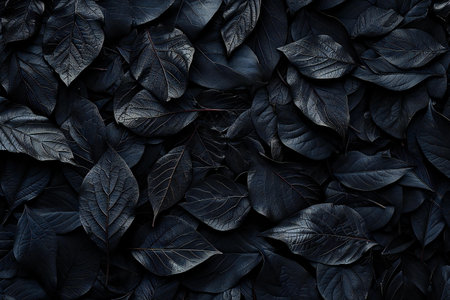 a photo of a black leaves background, inspired by the style of caras ionut. the image showcases organic forms with muted tones of dark silver and dark navy. it is a meticulously crafted photorealistic still life, featuring sculpted and texture-rich layers. this uhd image captures the intricate details of the black leaves and creates a visually captivating composition. ai generated