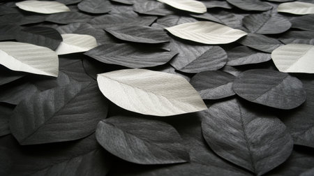 This captivating arrangement features an array of black and white paper leaves laid out on a surface, creating a visually appealing and artistic background.