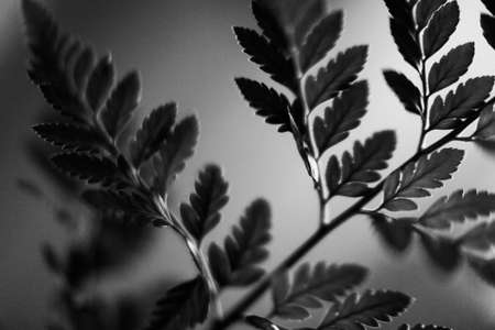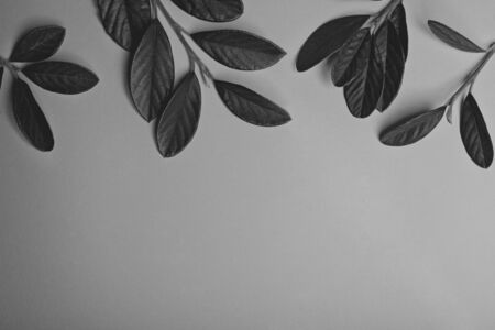 Sprigs with leaves. Black and white photo. Monochrome. Copy space.