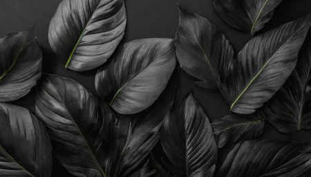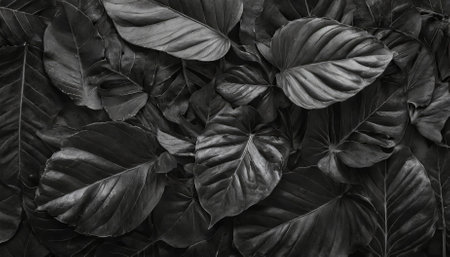 Explore the captivating textures of abstract black leaves, offering a striking tropical aesthetic. This flat lay image highlights the serene elegance of dark foliage, perfect for minimalist or
