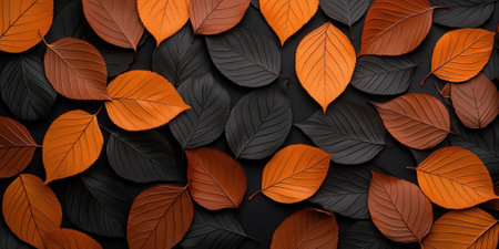 A captivating flat lay of vibrant orange and dark leaves offers a rich autumn aesthetic, ideal for nature-themed designs. Perfect for backgrounds and decorative uses.