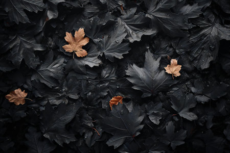 Dark black and golden leaves with dew drops in moody natural ambiance background.