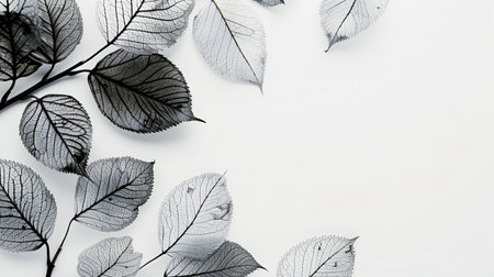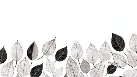an art print featuring black and white leaves on white paper, inspired by indonesian art. this vector image showcases a minimalist background with a silver and brown color scheme. the lively nature scenes and linear composition create spectacular backdrops in this high-definition (uhd) image. ai generated