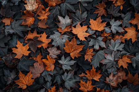 Autumn leaves background. Black and orange autumn leaves on the ground
