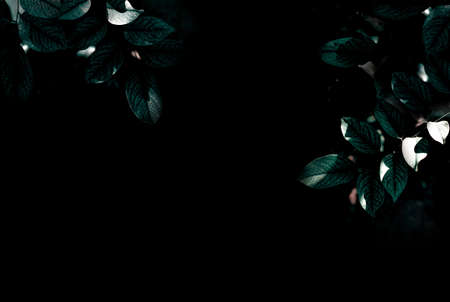 Dark tropical leaf background with abstract black textures, flat lay concept, copy space.