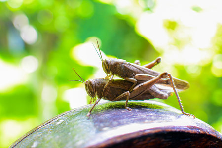 Yellowish-brown wooded locusts perched on top of the flash during the photocall