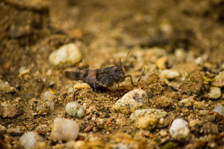 Blue Winged Grasshopper, Oedipoda Caerulescens. Endangered male grasshopper insect from Franconia, Germany