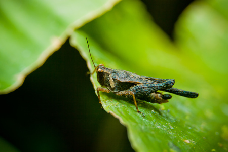 Monkey grasshopper or Erianthus versicolor Brunner, beautiful grasshopper on leaves with green background.