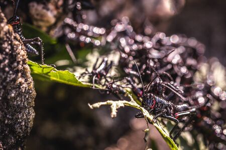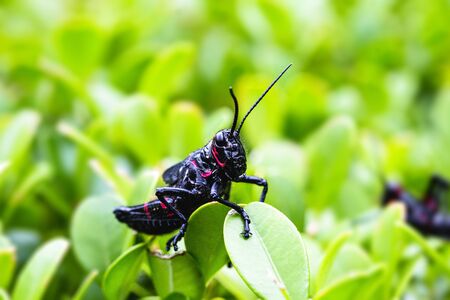 black and red cricket (Gryllus assimilis), pest. Good luck sign, cricket in close up. Garden plague, plague.