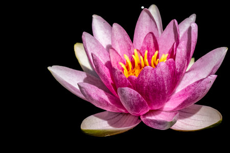 Pink water lily or lotus flower Perry's Orange Sunset in garden pond. Close-up of Nymphaea with water drops reflected on green water against sun. Flower landscape with copy space. Selective focus