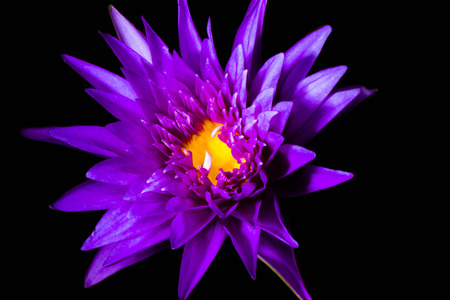 An overhead view of a striking purple water lily floating in dark, still water. The flower's vibrant purple petals surround a bright yellow and orange center. Green lily pads are visible on the surface of the water, some in focus and others blurred, adding texture and context to the aquatic scene.
