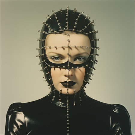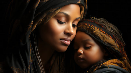 A young mother cradles her precious bundle, her delicate features adorned with bold red lips and long fluttering eyelashes, exuding a sense of fierce love and protectiveness