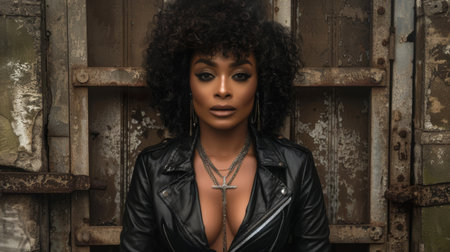 Confident African-American Woman in Leather Jacket Against Rustic Metal Background