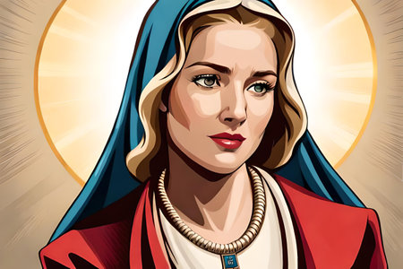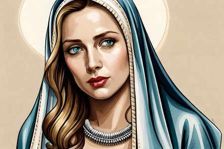 digital painting Illustration portrait of the holy virgin Mary with a veil, aureole and a christian cross