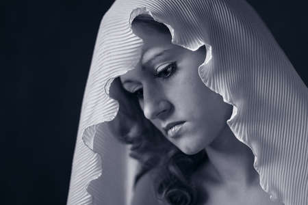 Close-up studio portrait of beautiful woman. Beautiful brunette model with black veil. Luxury makeup and bare shoulders monochrome
