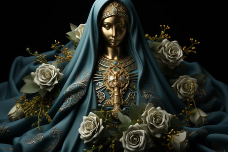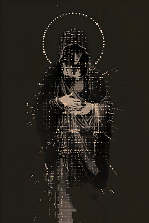 The Virgin Mary portrait with lilies on a dark background with rays of light. Modern art in religion.