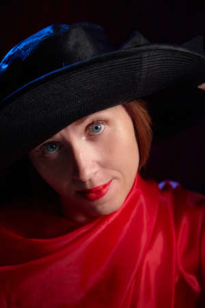 Portrait of ugle middle-aged woman with hat and red dress. Ugly model looking as lady posing in studio
