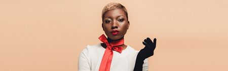 Fashionable attractive African American girl posing in red scarf and black gloves isolated on beige background