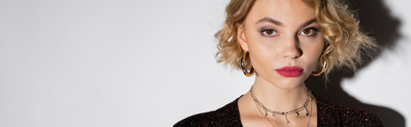 portrait of blonde young woman in golden hoop earrings and silver necklace looking at camera on white, banner