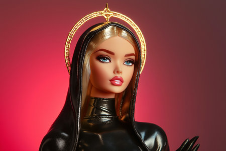 Artistic portrayal of a classic doll as a heavenly figure in golden light, saint. Modern beauty standards, idols from magazine, plastic surgery concept.
