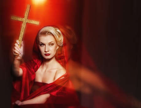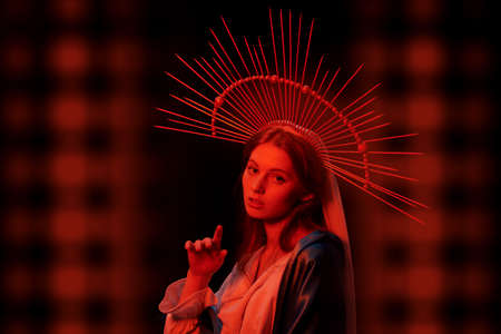The Virgin Mary portrait in red light on a black background. Modern art in religion.