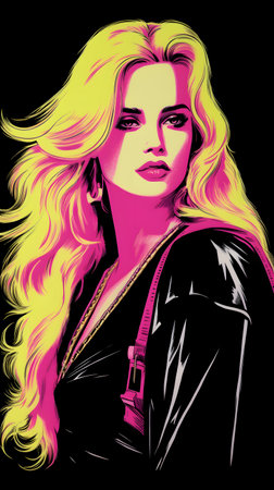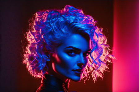 Fashion art portrait of beautiful woman with blond curly hair in colorful neon light.