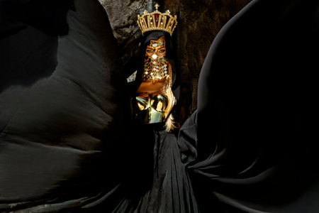 Majestic Woman in Black and Gold Royal Costume With Crown and Mask