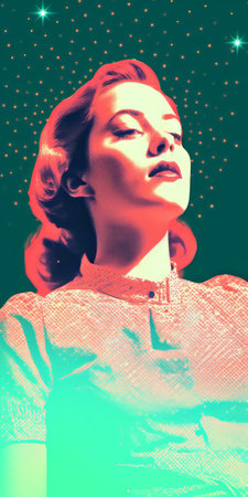 a minimalist portrait of a 1850s starlet sunbathing is captured in this photo. the frame is filled with a light faded orthonormal coordinate system of 8-bit dots and 8-bit colors, creating a kinetic art effect. the background features a vanished light lithography design, complemented by light halftone dots. the overall aesthetic of the photo is an ever-moving anaglyphic kaleidoscopic minimal psychedelic art. ai generated