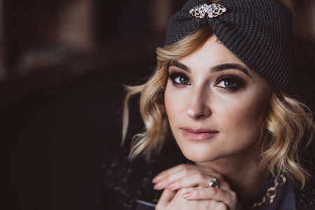 Portrait of a beautiful stylish blonde woman with smoky eye makeup in a knitted headband. Soft selective focus, defocus. No retouching.