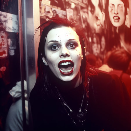 Woman with dark makeup and black attire suggestive of gothic fashion standing in front worn-out background