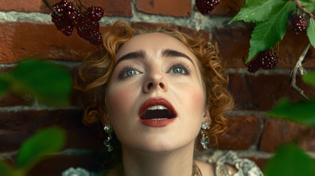 Close-up portrait of a woman with red hair and surprised expression, surrounded by blackberries