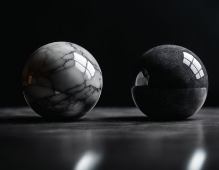 Black showing a single cracked dark marble sphere with a bright highlight reflecting on a polished surface in dramatic black and white lighting keywords: sphere,...