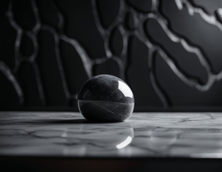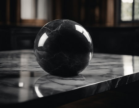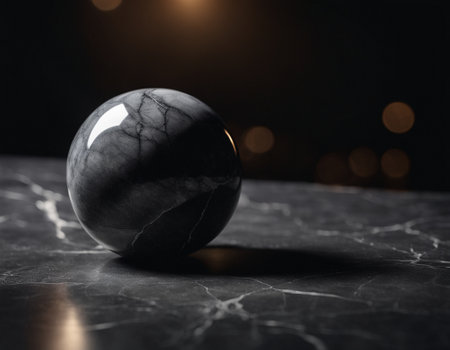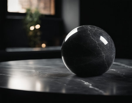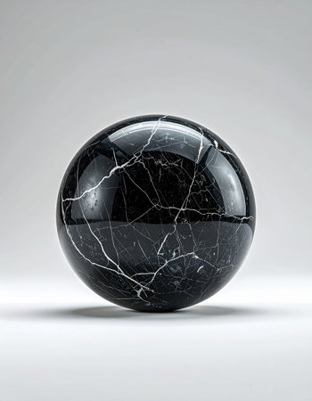 A perfectly polished sphere of black marble rests in a clean, minimalist space. Its dark, glossy surface is fractured by a network of delicate white veins, suggesting hidden energy, ancient wisdom, or the beautiful complexity within a simple form.