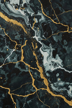 Swirling black, green, and white marbled design with shimmering gold veins. Luxurious and fluid. Ideal for interior design, fashion, and abstract art themes.