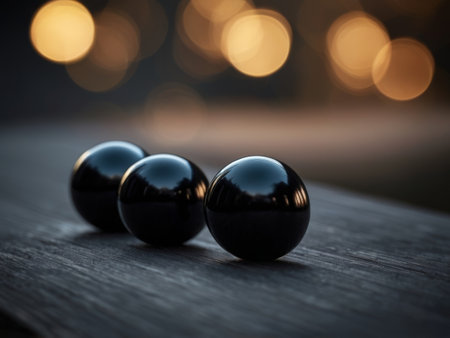 a black marble ball on a wooden floor.