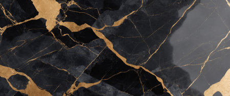 Splendid breccia or marble with a golden earthquake-like crack in a digital art generative AI. Modern abstract background of black marble hat has been eroded to reveal shiny golden cracks.