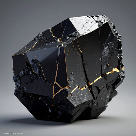 A striking black gemstone, once fractured, is now healed with veins of pure gold.