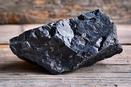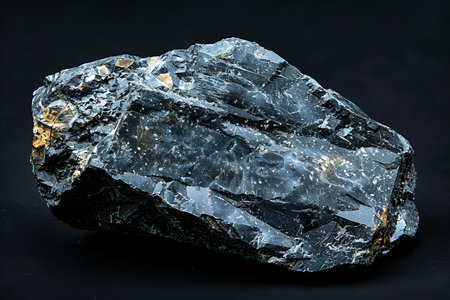 Close-up shot of a natural black mineral rock showcasing intricate textures and details against a dark backdrop. Ideal for geology or nature themes.